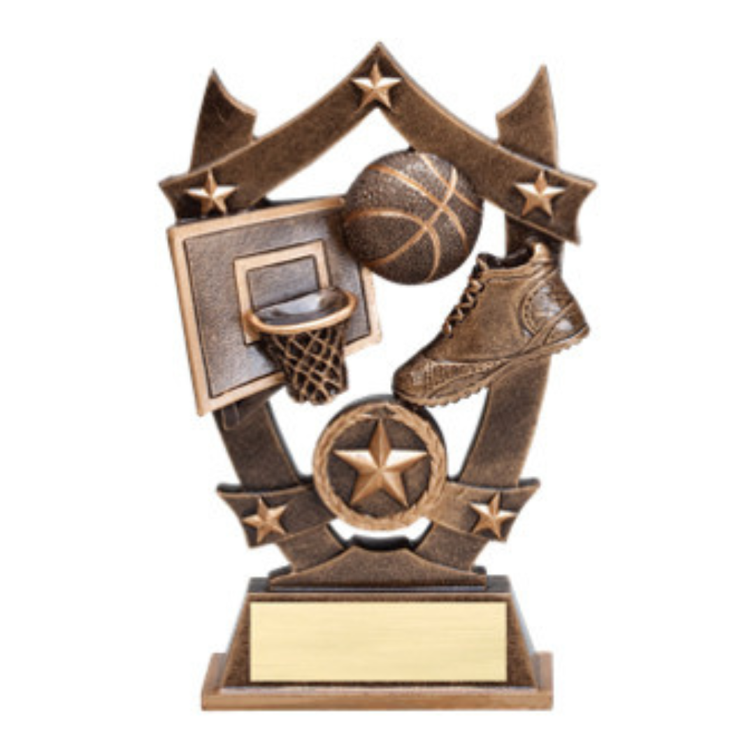 Reward your award-winning team members with our new Antique Gold Tone Resin Basketball Trophy! Featuring 40 letters of free personalization per trophy ($0.15 per additional character), this trophy is an unbeatable value !