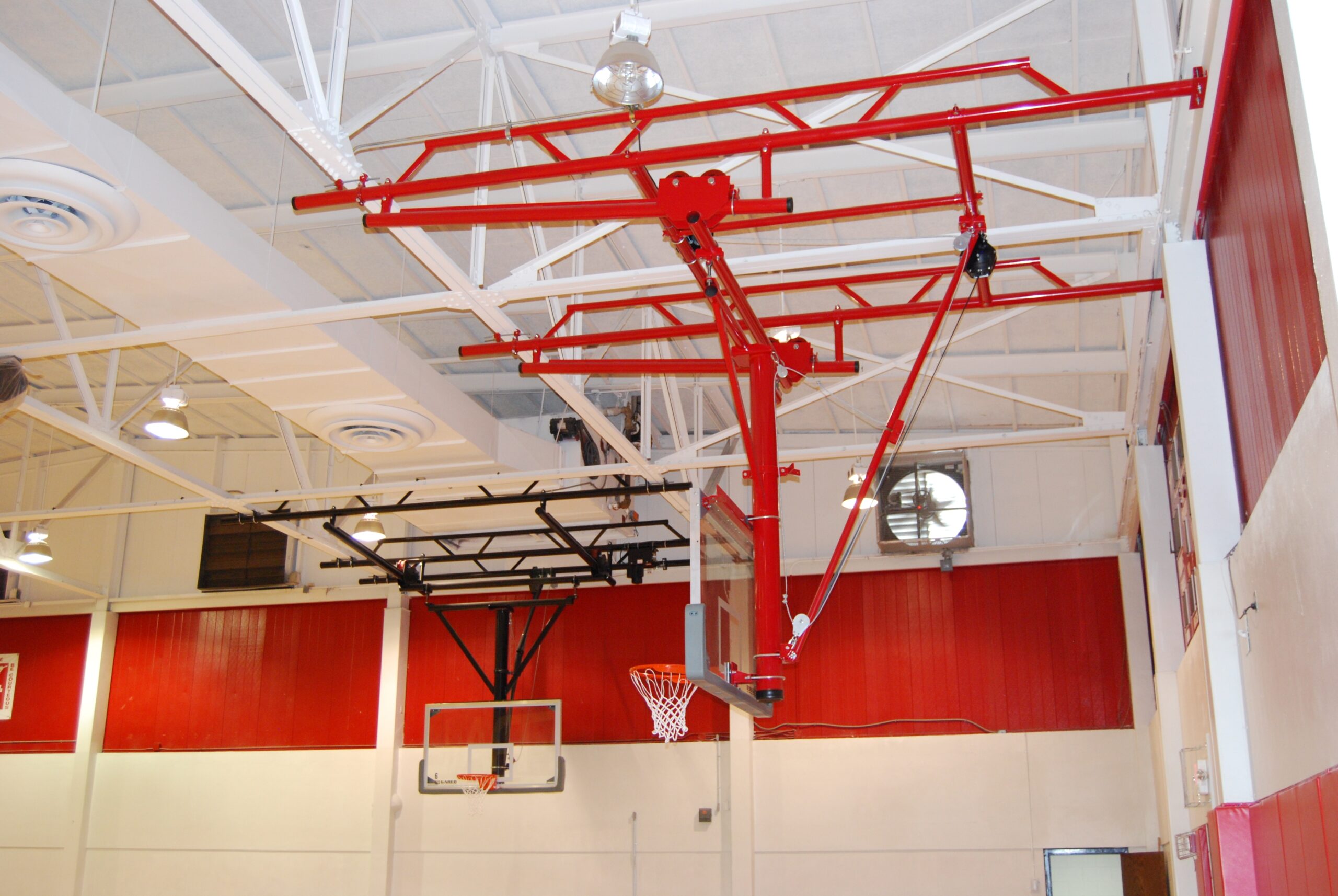 Single Post Rear-Braced Roll-Fold Ceiling Hung Basketball Backstop